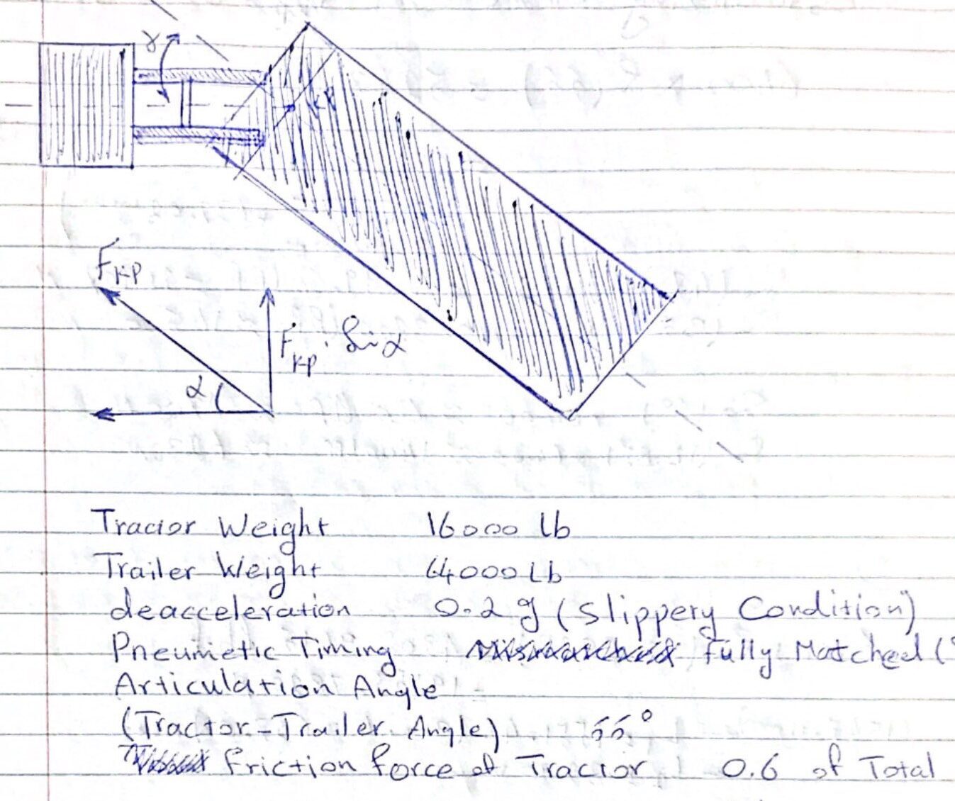 In the past both governmental organizations and academic institutions have conducted exhaustive research and study on lateral stability analysis of articulated vehicles, from which we learned a great deal. Here at PlusTime we took the study one step further with the purpose of utilizing the results to produce a solution that will eliminate jackknifing and make our roads safer. more Our Approach – Most of the commercial transport trucks seen on highways are of dry-van kind. In this combination a two axel 16m (53ft) trailer is hitched to a towing vehicle. Once fully loaded, these vehicles weigh 36,300Kg (80,000 pounds). Whereas a typical mid-sized passenger car weighs about 1800Kg (4000 pounds). 80,000 pounds by no means is the maximum weight of a laden transport truck that we see on the roads. The more axle a trailer has the more weight it can haul. The highest maximum allowed speed on our highways is 100 km/h. This is about 5 km/h less than maximum speed that a typical transport truck can travel. The fact that more mile a driver covers the more money he makes, as well as the rushed delivery schedule imposed by dispatches, compel drivers to drive as fast as they can. That is 105 km/h, for most of the time (about the speed of much smaller passenger cars). To slow down a moving vehicle or bring it to a full stop, the brake system of the vehicle converts its kinetic energy into thermal energy, through pressing brake pads against a heat absorbing component (disk/drum). The created heat is then dissipated into air, allowing drum to cool down for further heat absorption. The kinetic energy of a mass M travelling at the velocity of V is calculated as: E.K = (1/2) * M * V ^ 2 The direct correlation between the mass and kinetic energy in this equation means that the brake system of transport truck must be capable of handling 20-times more thermal energy than that of a passenger car. This underlines the importance of regular inspection and appropriate maintenance of brake system in transport trucks. Lateral Stability of Articulated Vehicles Stopping Distance – Total stopping distance is the distance that vehicle travels from the time that driver sees a hazard and presses on the brake until the vehicle stops. According to Federal Motor Carrier Safety Administration (FMCSA) a fully loaded tractor-trailer weighing 80,000 pounds traveling under ideal conditions at a speed of 100 kilometres per hour will take 160 meters to stop (almost the length of two football fields). Total stopping distance is made up of three parts: Perception Distance – The distance a vehicle travels while a driver is identifying, predicting and deciding to slow down for a hazard. Reaction Time – The time it takes for a driver to execute a decision once a danger is recognized. The distance your vehicle travels while you react is called a reaction distance. Braking Distance – The distance a vehicle travels from the time a driver begins pressing on the brake pedal until the vehicle comes to a stop. For further details on stopping distance please visit https://trucksmart.udot.utah.gov Pneumatic application Time – defined as the time required for the brake chambers to reach a relatively high-pressure level after the driver applies the brake control, effects vehicle stopping distance. The sooner that air pressure builds in the brake chambers, the sooner the vehicle will be able to reach its maximum deceleration rate, and the shorter the vehicle’s stopping distance. In addition to its impact on stopping distance, pneumatic application time of each unit in articulated vehicles during steady state braking, also affects the coupling forces between the units. This is a compressive force on fifth wheel of the towing unit, which results in bending moment on kingpin. Meaning, If the towing unit has considerably shorter pneumatic application time than that of its trailer, a forward compressive force will be exerted on the fifth wheel of the towing unit. On the other hand, in articulated vehicles with synched (or trailer with shorter) pneumatic application time, the force applied on the fifth wheel can be (but not always) considerably smaller or possibly negative (trailer pulling the trailer backward). For zero compressive force on fifth wheel, other conditions must exist, as it is explained below. If there exist a coupling force in an articulated vehicle and the articulation angle θ (the angle between towing vehicle and its trailer) is not zero, the F.Sin(θ) component of compressive force will result in a moment about the centre of gravity of the towing vehicle that can destabilize the vehicle. Therefor to maximize the lateral stability of an articulated vehicle, the compressive force on the fifth wheel of the towing unit must be minimized. Also, if ratio of brake force of each unit to total brake force of the rig is not the same as ratio of mass of that unit to total mass then there will be a compressive force on the fifth wheel of towing vehicle. Meaning if (braking force of a unit / total braking force of rig) not equal to (mass of that unit / total mass of vehicle), then there will be compressive force on the fifth wheel of the towing vehicle. Load distribution – Once dolly legs of a laden trailer in an articulated vehicle are lifted, drive axel of the towing vehicle will support a large portion of the trailer weight, without which brake force of the trailer wheels would not be able to support total load (the coefficient of the friction between the trailer tire and road remain the same, however the vertical pressing force is less on trailer wheels now, since a significant portion of it is supported by drive axel of the towing vehicle). This necessitates brakes of the towing vehicle to be sized in a way that it can provide brake for the portion of the trailer load that it supports. This means that during steady state braking the compressive force on the fifth wheel of the towing vehicle will always exist regardless of how a