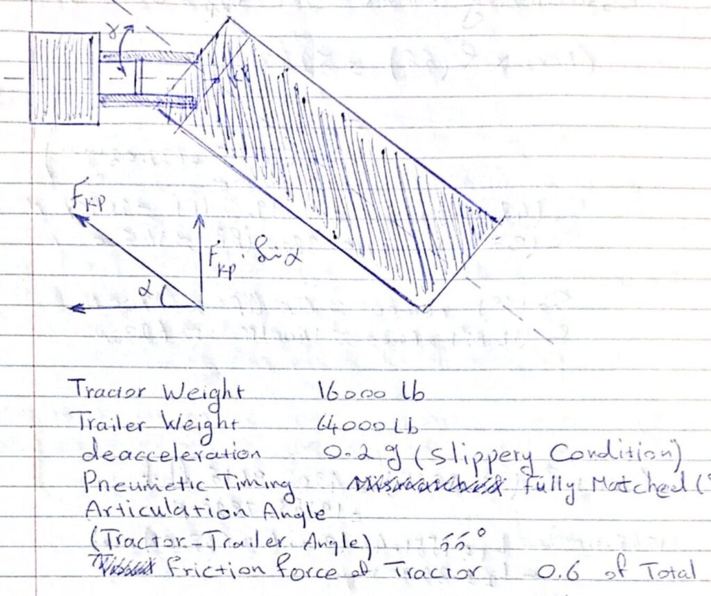 Performance of brakes directly effect magnitude of the compressive force from the kingpin of the trailer on the fifth wheel of the towing unit. When the articulation angle is not zero, the radial component of this force will create a moment that causes the towing vehicle to spin around its centre of gravity, consequently causing the existing articulation angle to increase. If the articulation angle passes the “point of no return” jackknifing will occur.
